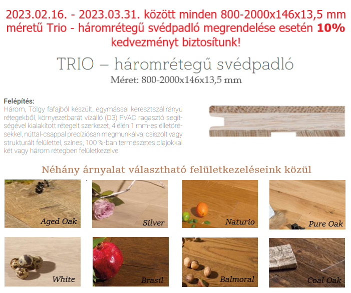 Most minden 800-2000x146x13,5 mm méretű TRIO - háromrétegű svédpadló megrendelése esetén 10% kedvezményt biztosítunk!